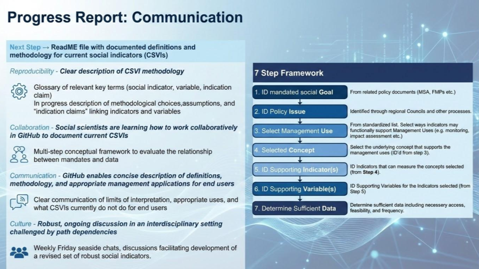 Cameron Speir’s Openscapes participation is part of a larger project in the NMFS Social science community: the Community Social Vulnerability Indicators (CSVI) reproducibility project. CSVI does two things: 1) Classifies communities by engagement and reliance on commercial and recreational fishing and 2) Characterizes social, demographic, and economic well-being of those communities. Cameron shared three progress reports on his Openscapes goals: reproducibility, communications, and data storage. He aims to build awareness so that even people who didn’t need to know about the code can still know about the decisions going into the CSVI indicators.
