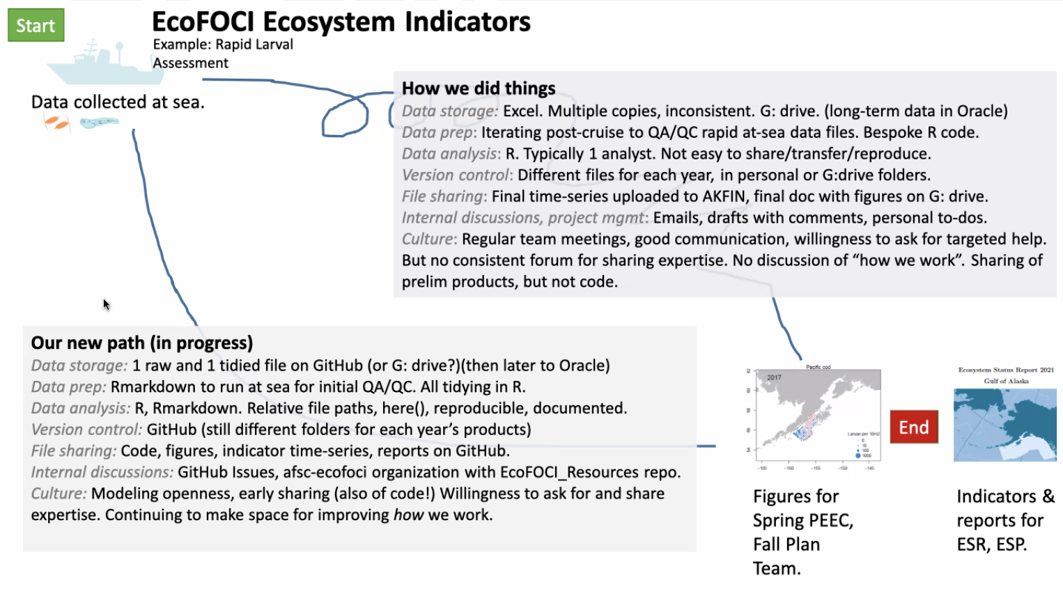 The EcoFOCI Ecosystem Indicators Team Aimed to streamline, document, and standardize survey data analysis and annual reporting of EcoFOCI ecosystem indicators for ESRs and ESPs. Before openscapes, the team felt that tight timelines forced the team to work “quickly; not always carefully” and that the Openscapes training gave them space to explore easier, faster, and more consistent ways to prepare results. They created a GitHub organization to help them codify data and code, and more importantly, invest in culture change. The team heavily discussed establishing a culture of modeling openness, sharing early code, and asking for expertise. The team aptly phrased the latter as “hidden expertise,” as the expertise may exist, but on local computers and unbeknownst to their peers, forcing others to reinvent workflows and processes that were already established.